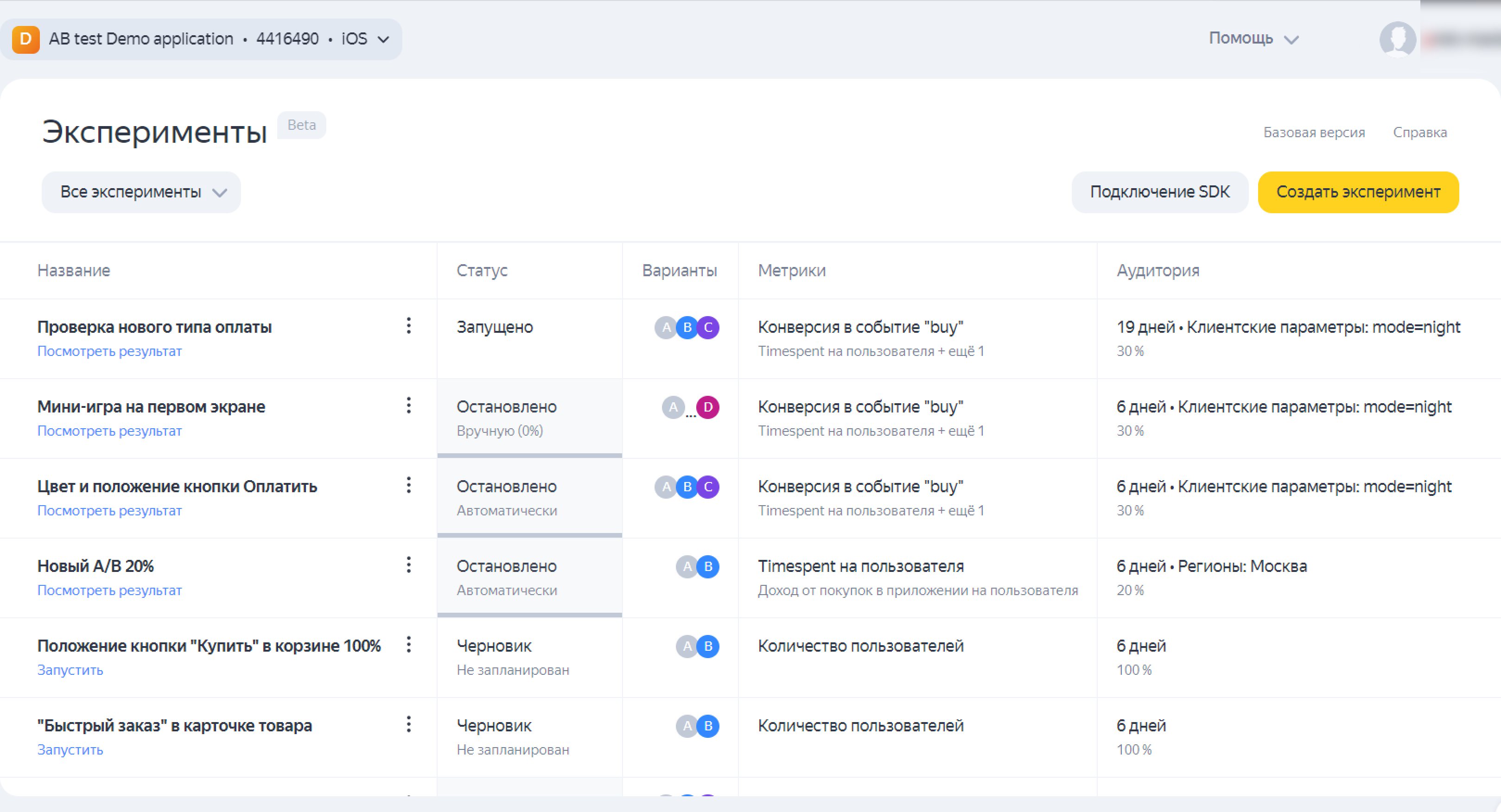 Теперь в интерфейсе AppMetrica можно не только собирать аналитику, но и влиять на приложение. С новым инструментом «А/Б эксперименты» вы можете проводить А/Б тестирование продуктовых и маркетинговых гипотез и внедрять изменения в приложение прямо в AppMetrica.