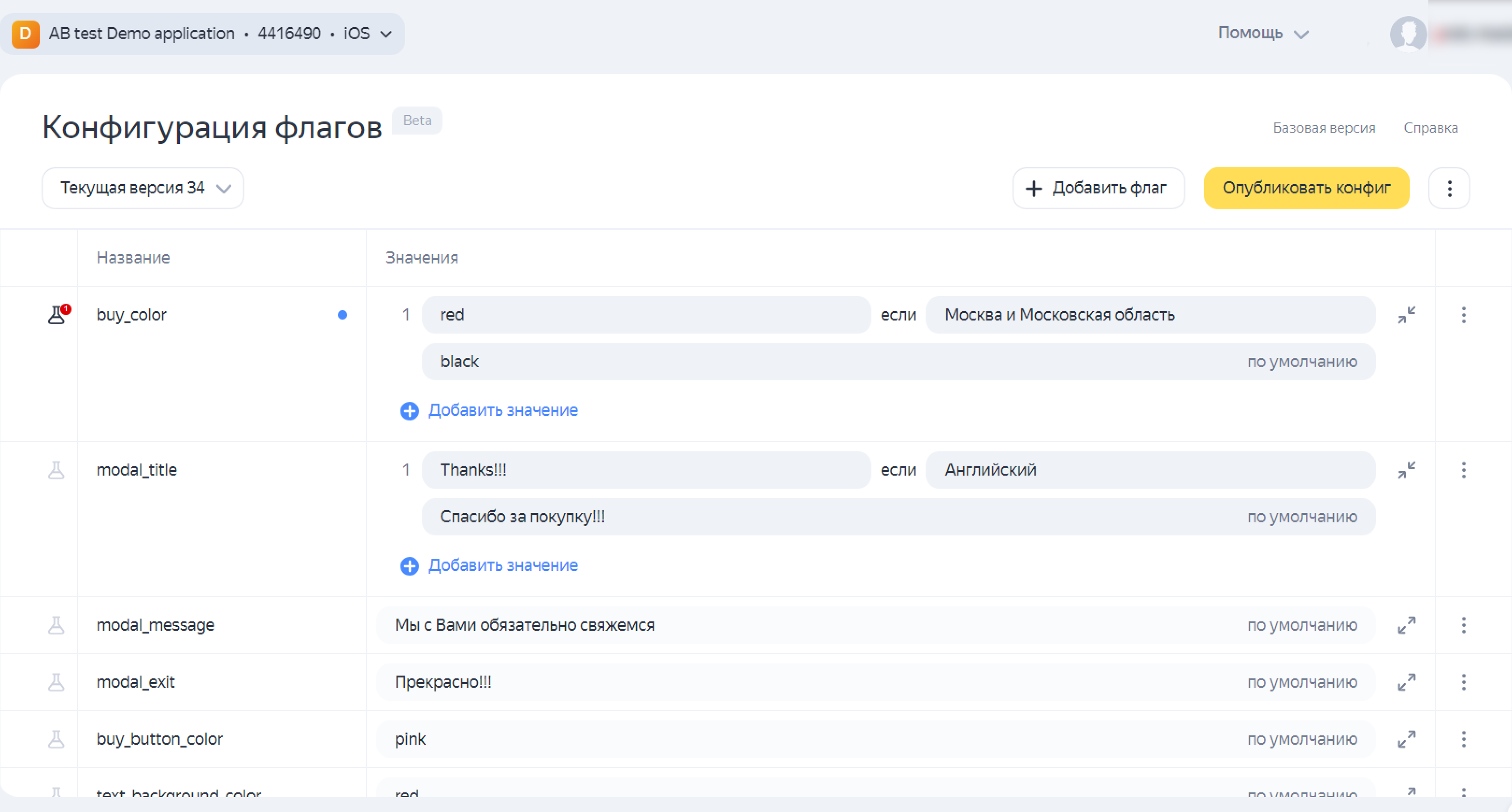 Чтобы изменять контент приложения прямо из AppMetrica, мы предлагаем Конфигурации флагов (также их называют Feature Flag или Remote Config). С их помощью можно задать любую характеристику приложения, например новый баннер, цвет кнопки, раздел в интерфейсе или способ размещения рекламы. Всего можно настроить до 2 000 различных флагов.