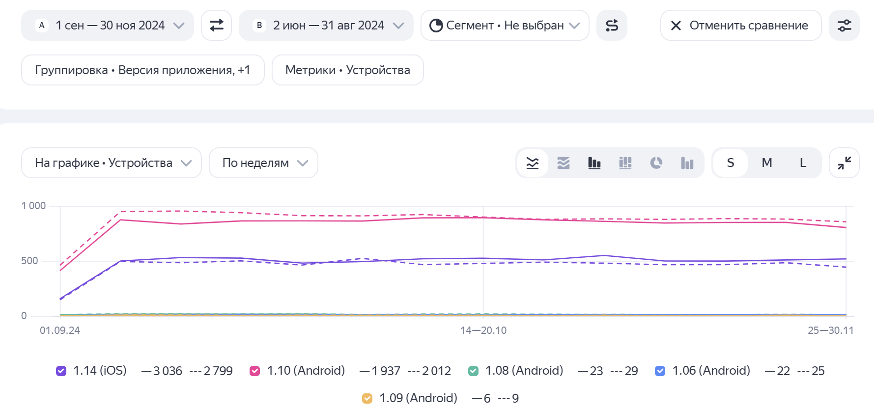 Теперь можно сравнивать данные за разные периоды или сегменты пользователей прямо в интерфейсе. Можно сравнивать одновременно разные сегменты в разных периодах. При переходе между отчётами выбор сравниваемых периодов и сегментов сохраняется. Обновление поможет проверять гипотезы, оценивать влияние кампаний и анализировать поведение пользователей.