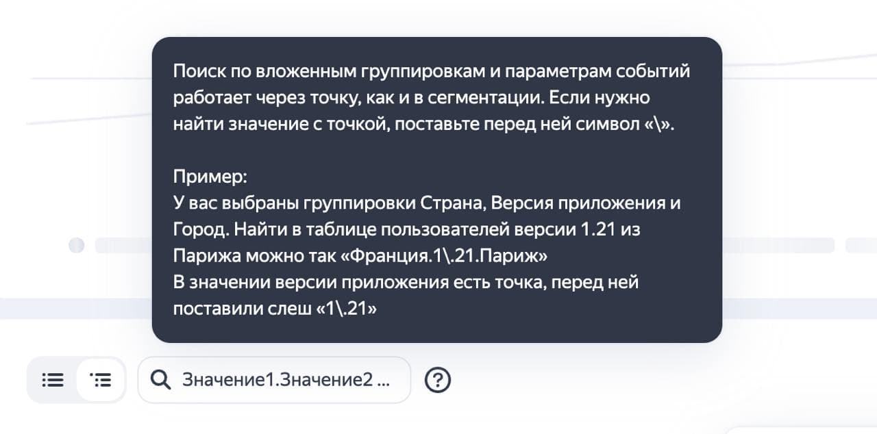 Поиск по вложенным группировкам и параметрам событий работает через точку, как и в сегментации. Если нужно найти значение с точкой, поставьте перед ней символ «\».
