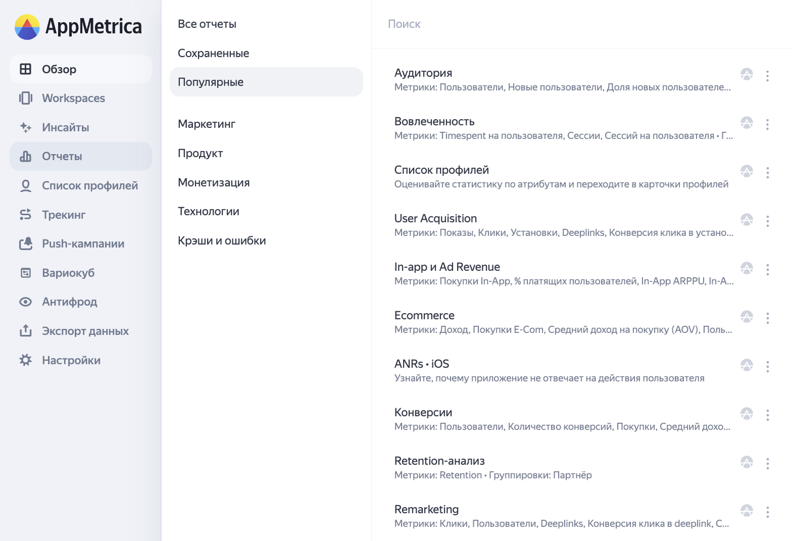 Все отчёты теперь систематизированы по ролевому принципу, что упрощает поиск нужной информации. Мы разделили их на пять логических категорий: отчёты по маркетингу, продукту и монетизации, блок «Технологии», отчёты «Крэши и ошибки».