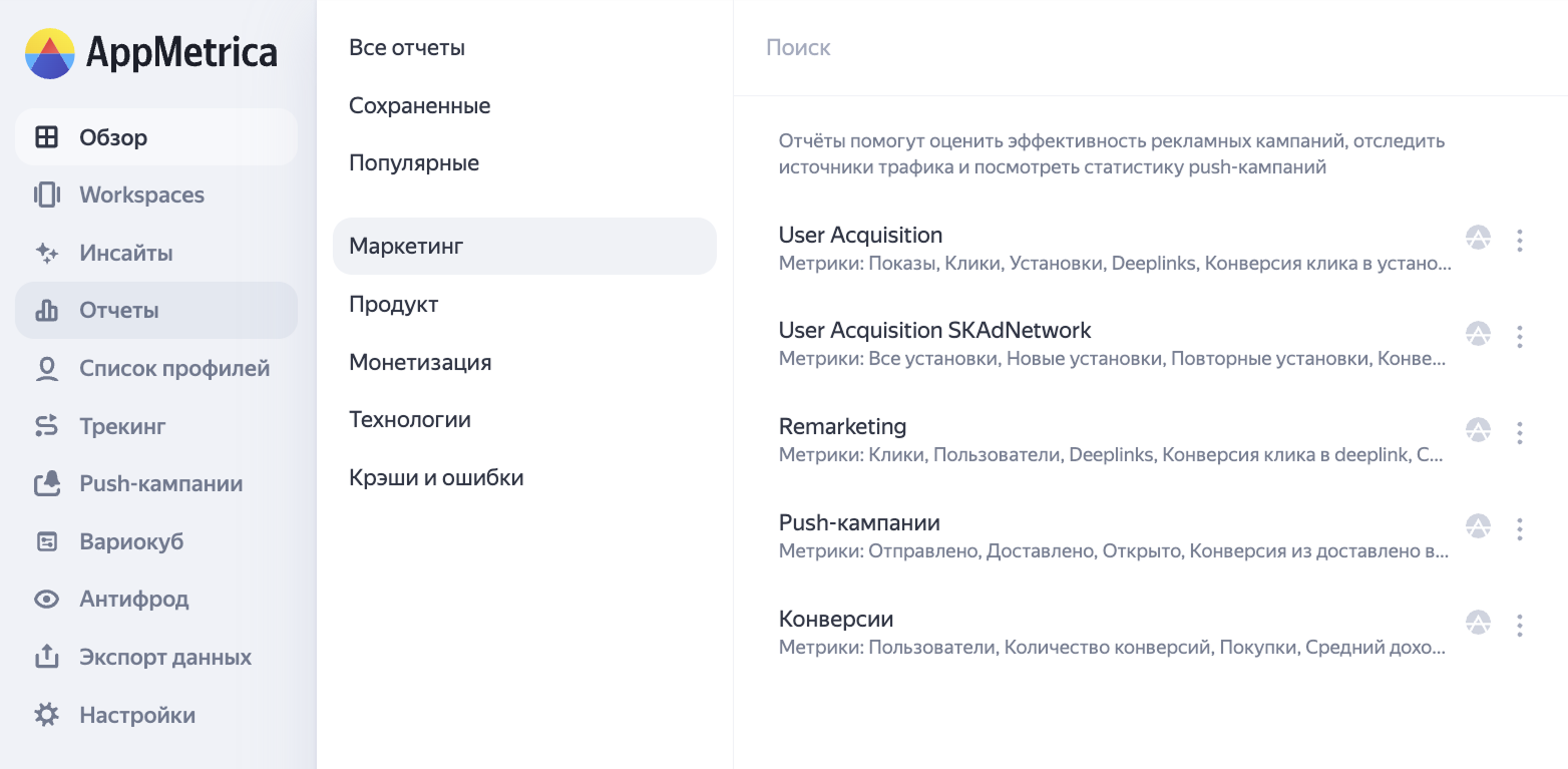 - Маркетинговые отчёты нужны для оценки эффективности рекламных кампаний, помогут отследить источники трафика и посмотреть статистику пуш-кампаний. В этот раздел войдут отчёты User Acquisition, User Acquisition SKAdNetwork, Remarketing и «Push-кампании».
