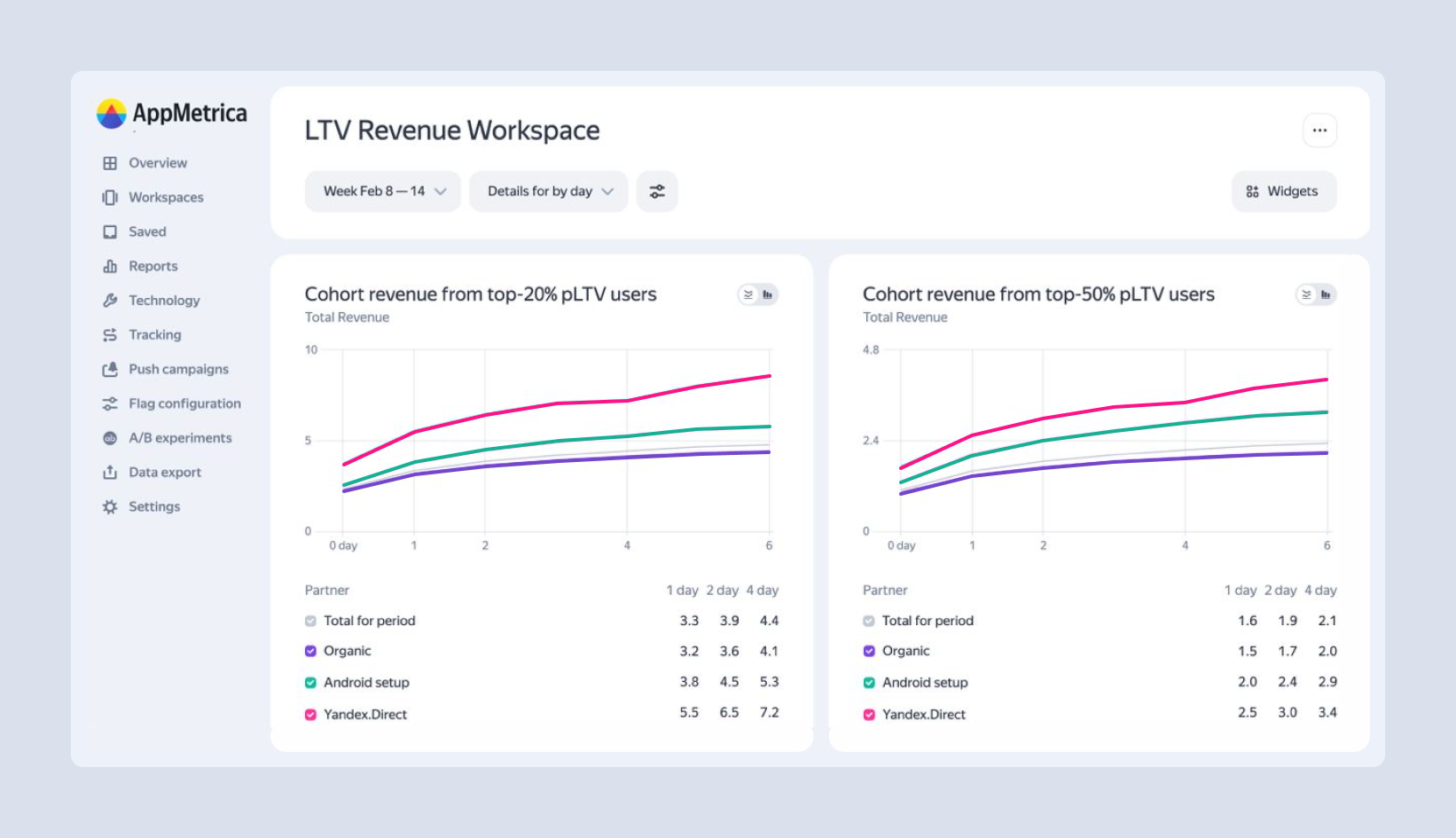 LTV predictions evaluate each user within 24 hours of them joining the app and form an LTV prediction for 28 days that follow. Based on these forecasts, you can send postbacks into your ad network directly from AppMetrica and optimize campaigns for topLTV users with just a few clicks.