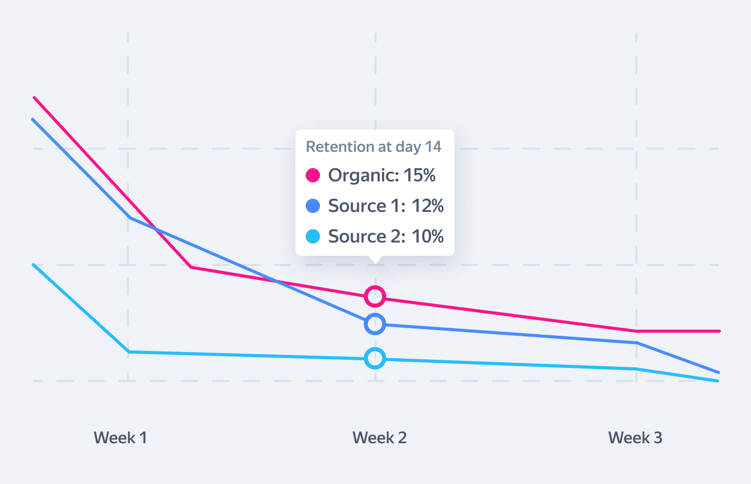 Ramp up growth by measuring ad effectiveness. And picking your best traffic sources with detailed new user behavior reports.