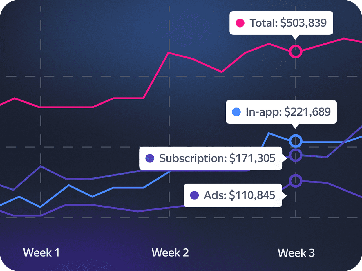 Enjoy quick access to monetization metrics with a revenue report that covers all in-app monetization types.